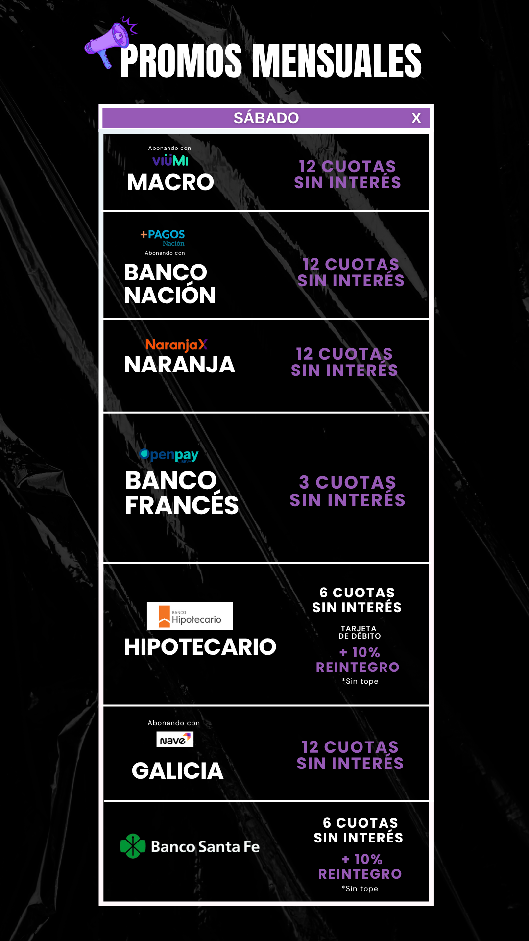 Hasta 12 cuotas sin interés con Visa, MasterCard, Cabal y Naranja.